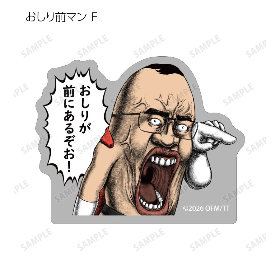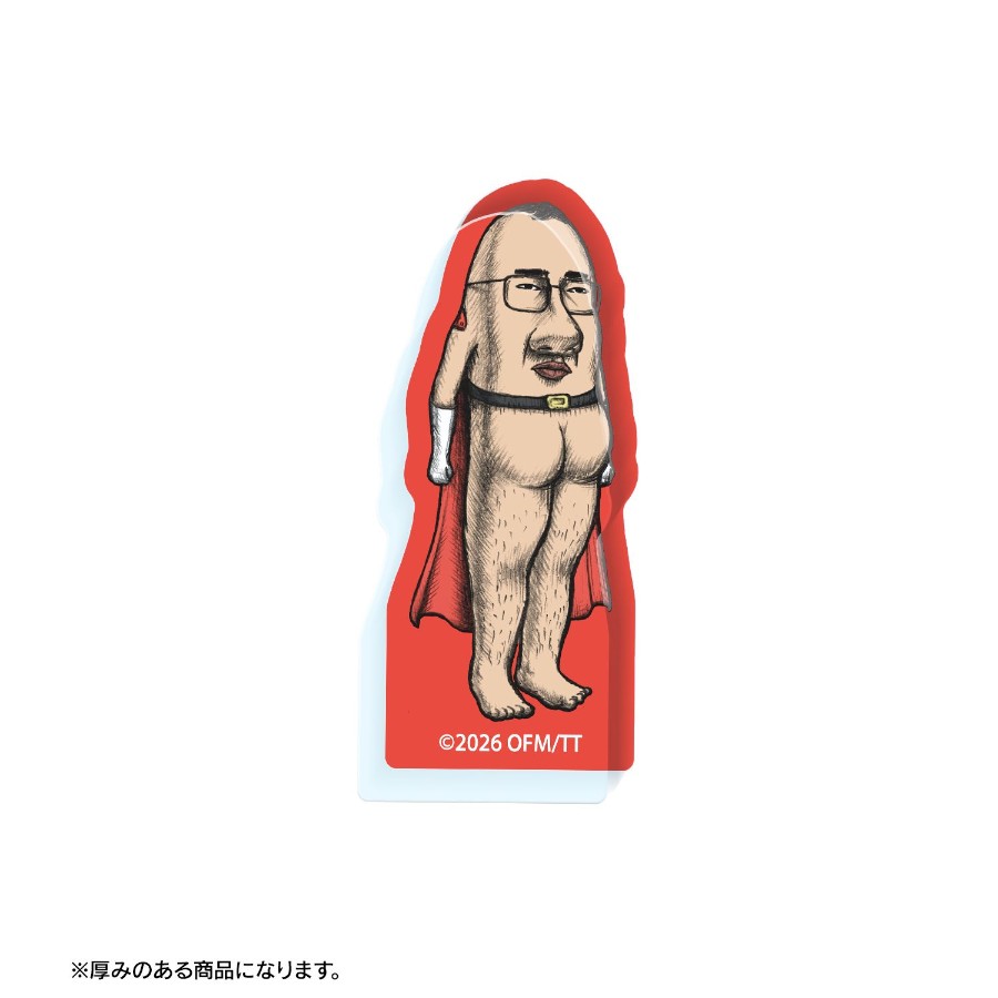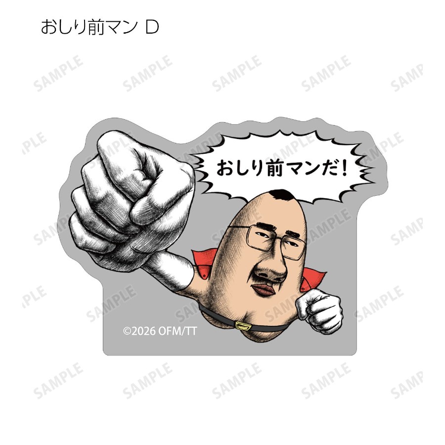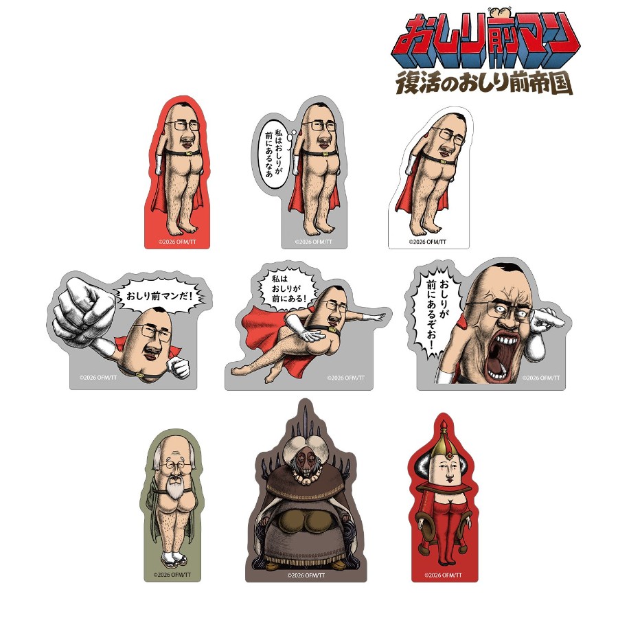 『おしり前マン~復活のおしり前帝国~』より、トレーディングアクリルマスコットの登場です。 おしり前マン、おしり前レジェンド、黒幕製薬の社長、おしり前姫のカラーイラストをアクリルマスコットに仕上げました。 厚さ8mmのアクリルとなっており、台座無しで自立するため、そのまま飾ったり、並べることもできます。 お部屋やデスクまわりなどに飾って、キャラクターとの日常をお楽しみください。