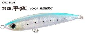 オシアペンシル 別注平政 190Fにシマノ独自のフラッシングシステム、フラッシュブーストを搭載。さらに重さを増した専用成型ウェイトを後方重心にレイアウトすることで、ジャーク後のステイ時の姿勢をファインチューン。ジャーク後に姿勢を復元しやすくなっただけでなく、水絡みが向上したことでダイブミスの低減やさらなる複雑なスラロームアクションが演出可能になりました。使用するトリプルフックは#3/0を推奨。シングルフックの場合は1本5~7gを目安に使用することがおすすめです。いずれの場合でも使用するタックルや演出したいアクションに応じてチェンジするのも一手。安定した飛距離、ダイブのさせやすさ、アクションのキレを実現した新定番ペンシルの登場です。