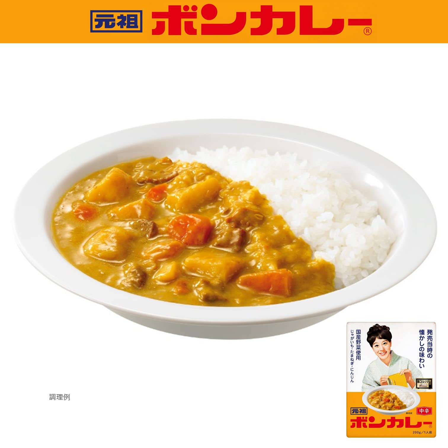 「元祖ボンカレーは」、発売当時の懐かしの味わいをお楽しみいただけます。あめ色たまねぎのコクと炒めた小麦粉の香ばしさ薫るカレーです。国産じゃがいも・たまねぎ・にんじん使用。