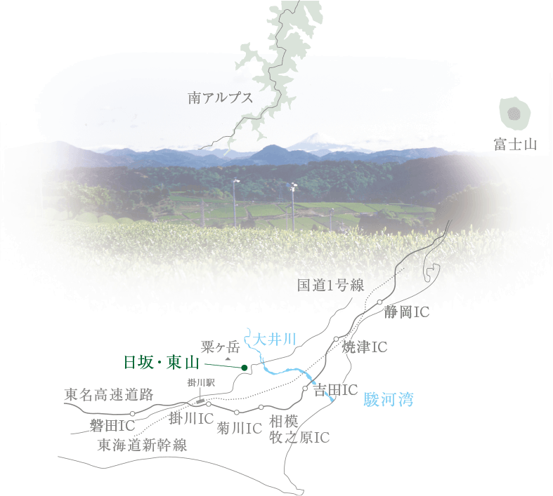 掛川市東部、粟ヶ岳の麓:日本有数の茶産地で栽培。肥沃な土壌、昼夜の温度差、収穫期の霧など、最高級茶葉に最適な条件。