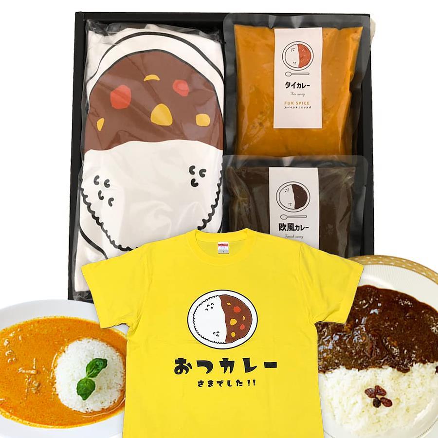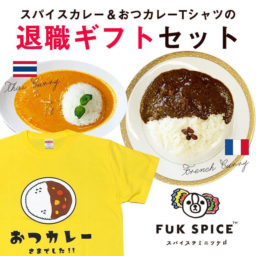 退職祝いにぴったりの退職お疲れさまギフトセット。スパイスカレーに、おつカレーのおもしろTシャツをおまけでつけたオリジナル感満載の贈り物です。