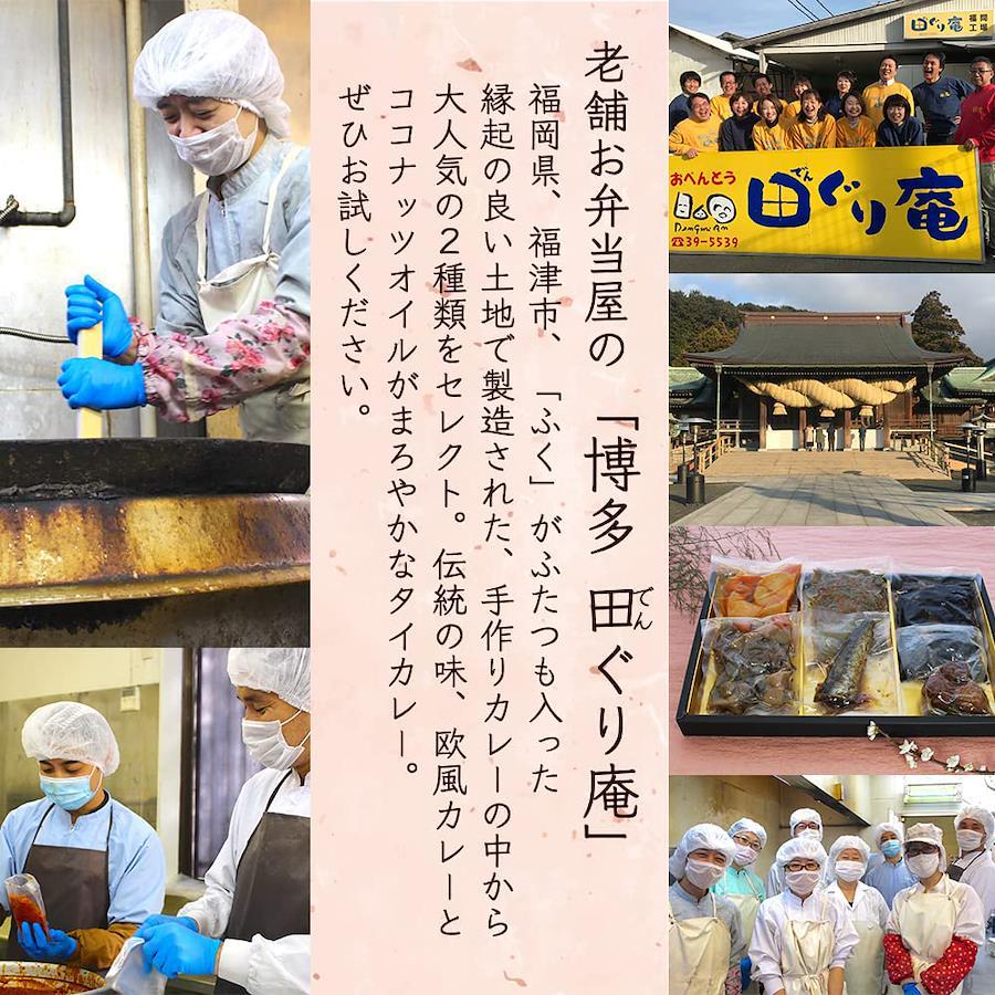 九州博多の老舗惣菜店「田ぐり庵」の手作りレトルトカレーです。●タイカレーは、豚肉と竹の子がたっぷり入った辛口カレーです。 独特の調味料カピの風味がクセになります。ココナッツオイルのまろやかさかも辛さとマッチして大人気の商品です。【注意】仕入れ状況によりカレーの種類が変更となる場合があります。