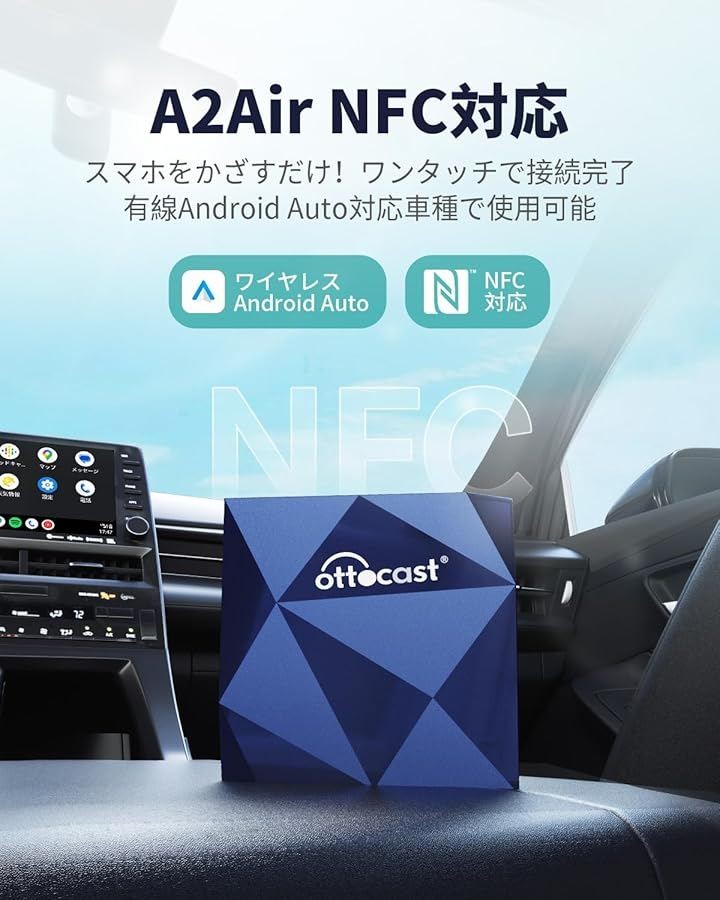 ワイヤレスAndroid Autoで快適なドライブを」A2AIR NFCは、2025年最新のワイヤレスAndroid Autoアダプターです。