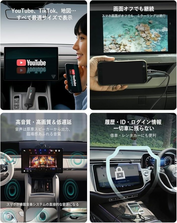 「双方向制御ミラーリングアダプター Mirror Touch新登場」「Ottocast Mirror Touch」は、普段お使いのスマートフォンの画面を、愛車のディスプレイにそのまま映し出せるミラーリング機能搭載カーアダプターです。