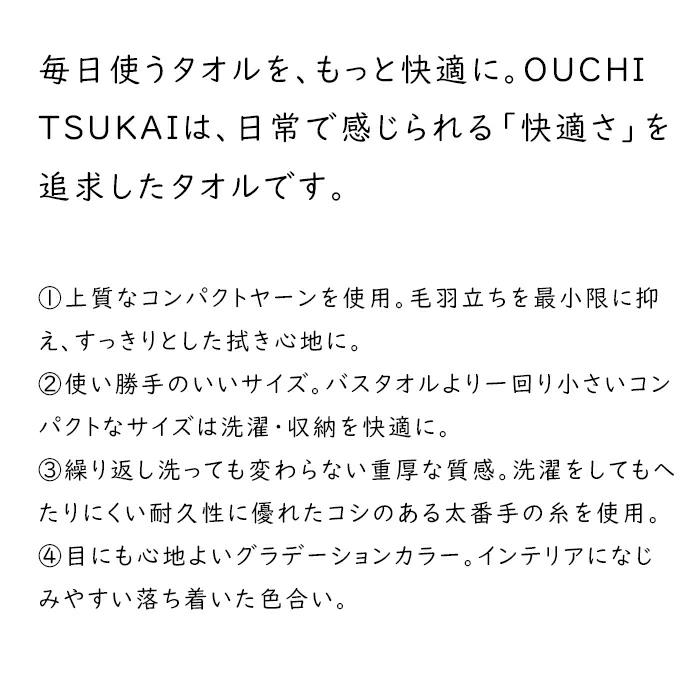 毎日使うタオルを、もっと快適に。OUCHI TSUKAIは、日常で感じられる「快適さ」を追求したタオルです。上質なコンパクトヤーンを使用。毛羽立ちを最小限に抑え、すっきりとした拭き心地に。使い勝手のいいサイズ。バスタオルより一回り小さいコンパクトなサイズは洗濯・収納を快適に。繰り返し洗っても変わらない重厚な質感。洗濯をしてもへたりにくい耐久性に優れたコシのある太番手の糸を使用。目にも心地よいグラデーションカラー。インテリアになじみやすい落ち着いた色合い。