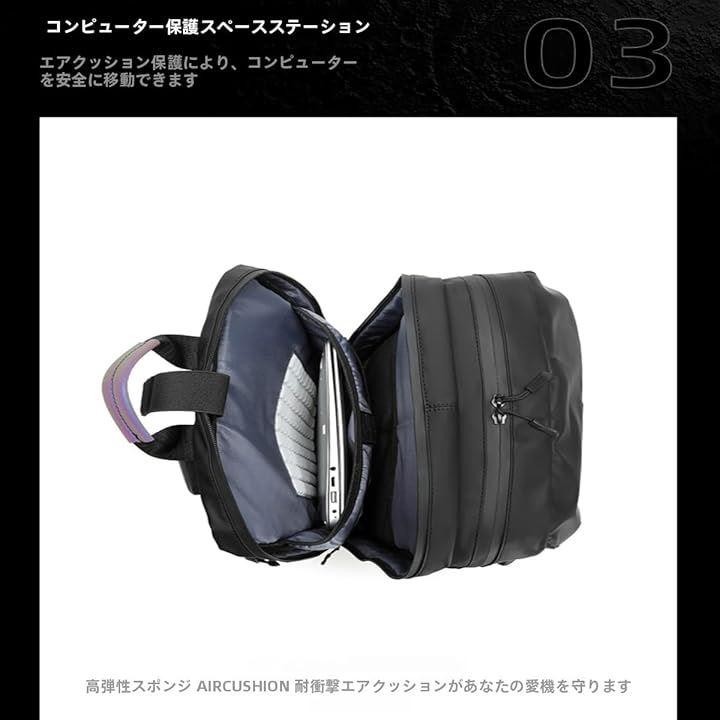高密度ナイロン素材と特殊コーティングにより優れた防水性と耐撕裂性を実現し、16インチのノートPCを衝撃から保護する専用クッションコンパートメントを内蔵。