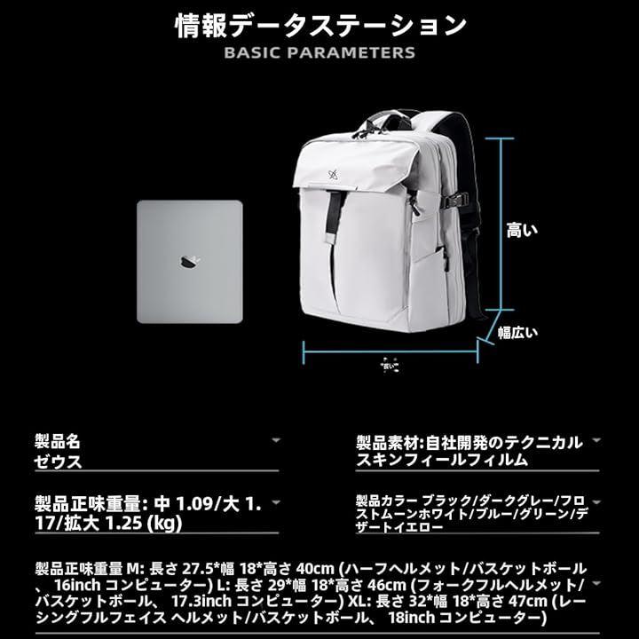 *商品詳細仕様 サイズ:縦40x横27.5xマチ18 cm 容量:25リットル(通常版には拡張機能はありません) 重量:1.09 kg 素材:高密度ナイロン(防水・耐摩耗加工) 対応PCサイズ:16インチノートパソコンまで *主な特長 ・高密度ナイロンと特殊コーティングによる高い防水性能で雨天でも安心 ・耐撕裂性に優れ、過酷なアウトドア環境でも耐久性を発揮 ・軽量設計(約1.09kg)ながら拡張ジッパーで容量を最大38Lまで調整可能 ・ヘルメットフックと360度反射テープで安全性を向上 ・独立したシューズ収納ポケットと濡れ物仕切りパネルを装備 ・人間工学に基づいた3Dメッシュバックパネルで通気性と快適性を確保 ・調整可能なショルダーベルトで負荷を分散 ・USB充電ポート付きケーブルガイドで移動中の充電をサポート 13の独立した収納スペースにより、効率的な整理が可能。