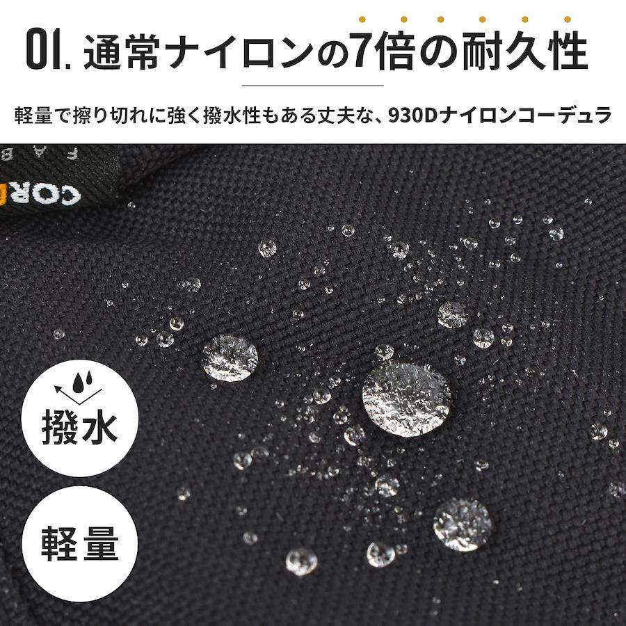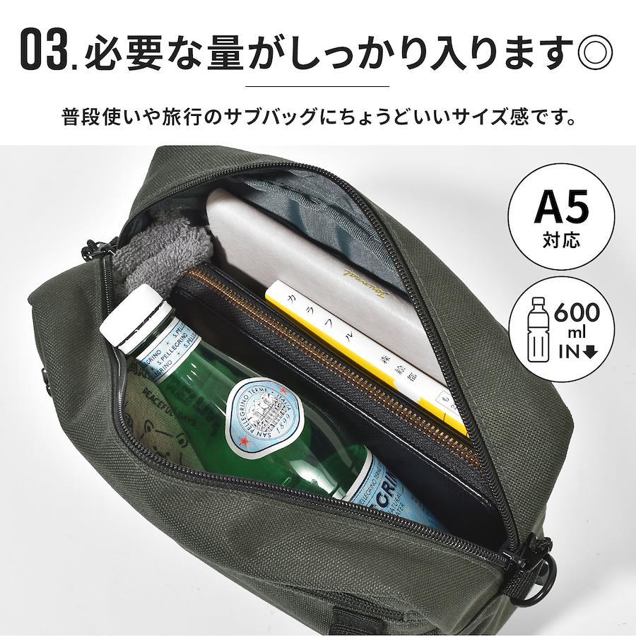ペットボトルもゆったり収納できるサイズ感で、日常使いに適した横型ショルダーバッグ。フロントにジッパーポケット、背面にベルクロ式フラットポケットを備え、取り出し頻度の高い小物の収納に便利。Wファスナー仕様のメインルームは開閉しやすく、内部には仕分けポケットも装備。正面右側のDリングにはアクセサリー類の装備が可能。左サイドのハンドルで手持ちにも対応。ミニマルなデザインに実用性を融合させた機能的なバッグです。