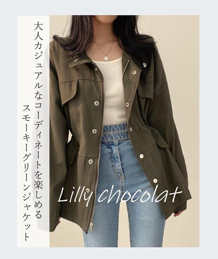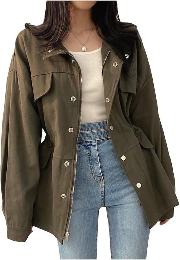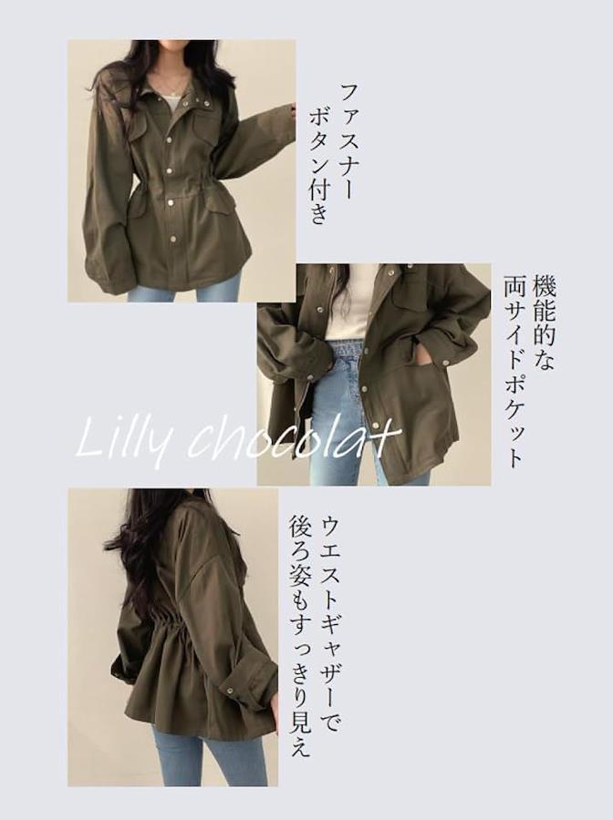 お尻まで隠れる丈感や縦ラインがキレイなミリタリージャケットを羽織れば、スッキリとした印象にまとまります。
