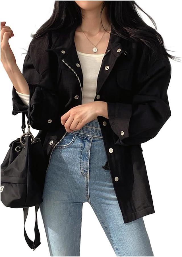 お尻まで隠れる丈感や縦ラインがキレイなミリタリージャケットを羽織れば、スッキリとした印象にまとまります。