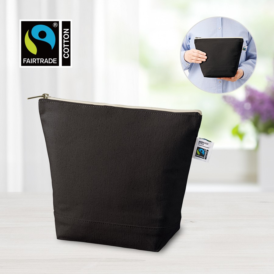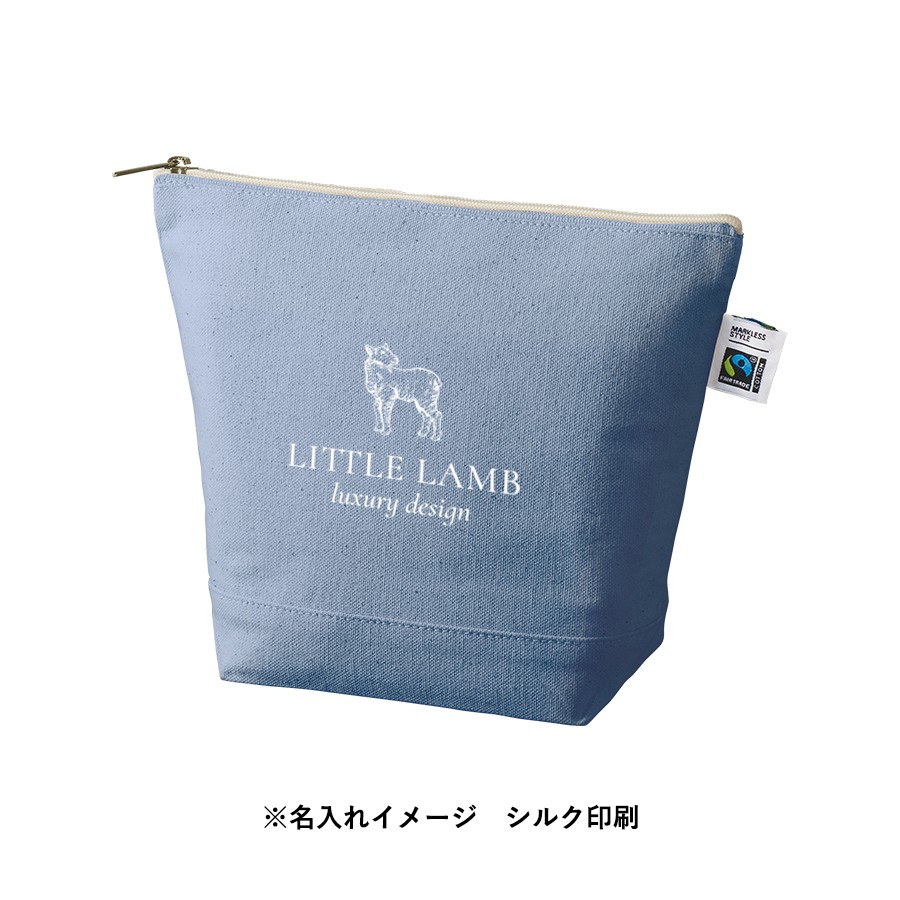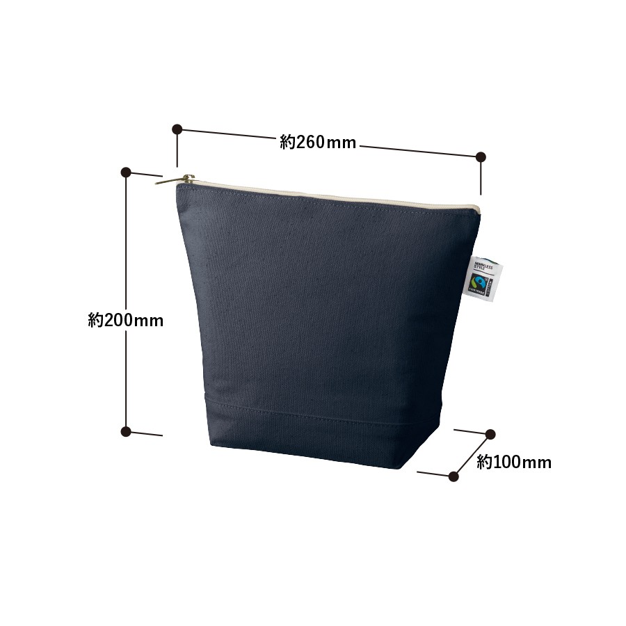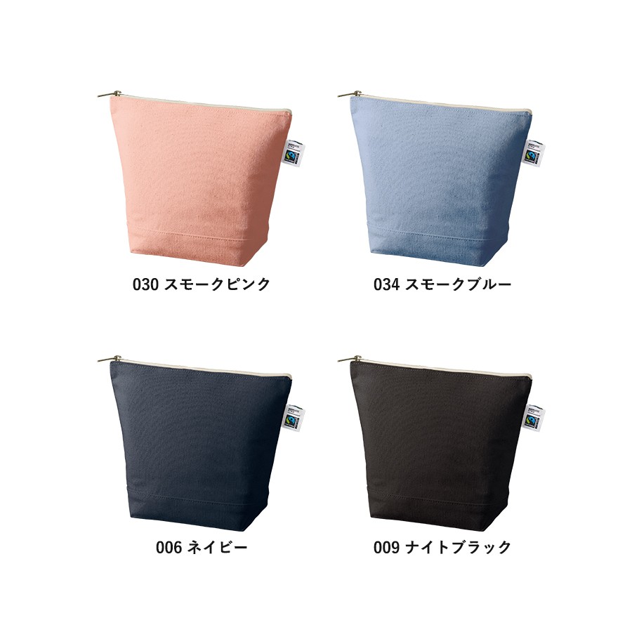 フェアトレードコットンを使用したキャンバスポーチです。人気の舟形形状でマチもあるのでしっかり収納することができます。Sサイズはハンドクリームやコスメ周りの商品を入れる普段使いや、トラベルでの使用におすすめです。サイズはSサイズ・Mサイズの2サイズ展開しており、ご利用用途によって使い分けがしやすい商品です。国際フェアトレード認証ラベル付きのアイテムとなっており、SDGsやサスティナブルへの取り組みで企業価値を高められます。染色工場もフェアトレード認定工場で生産されており、染料は第三者認証を受けた製造工場で生産しているものを使用しております