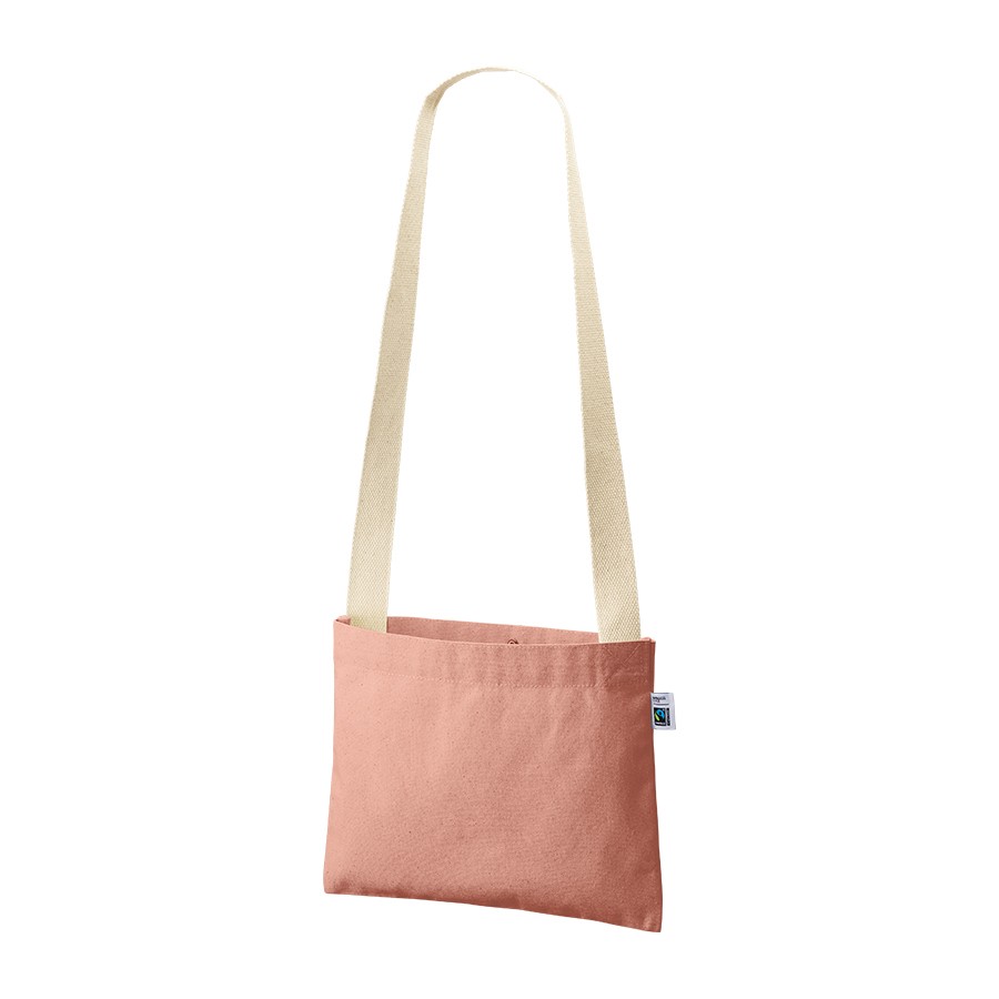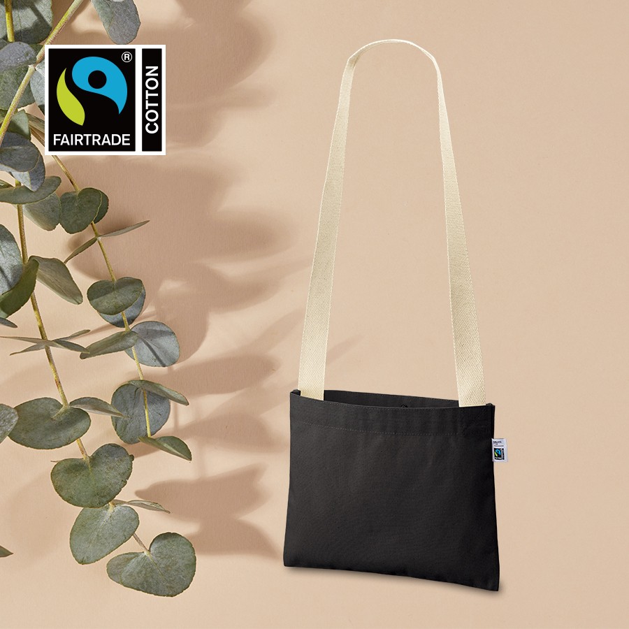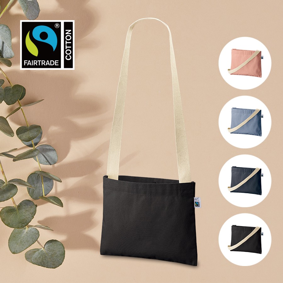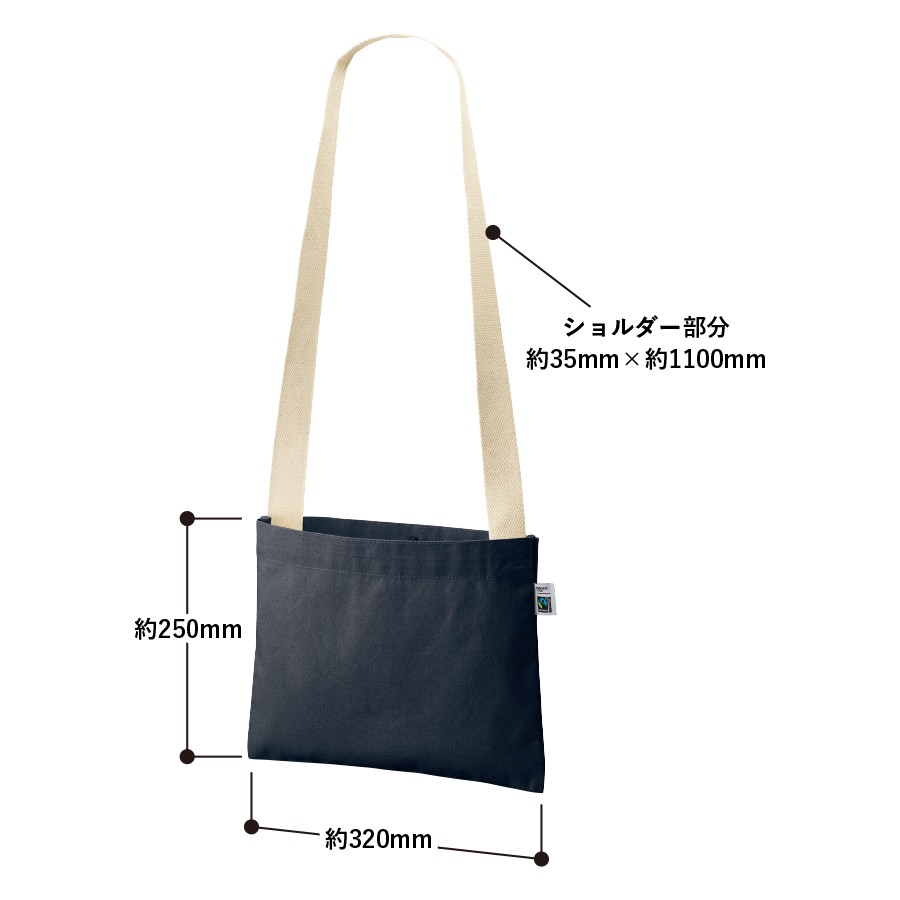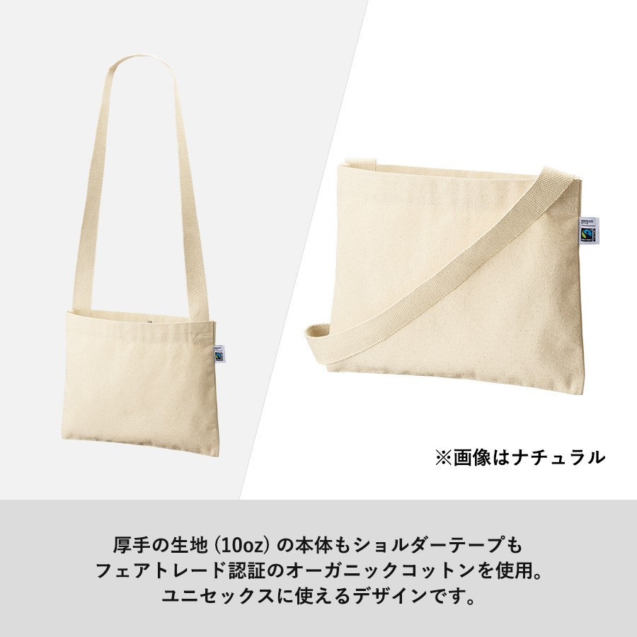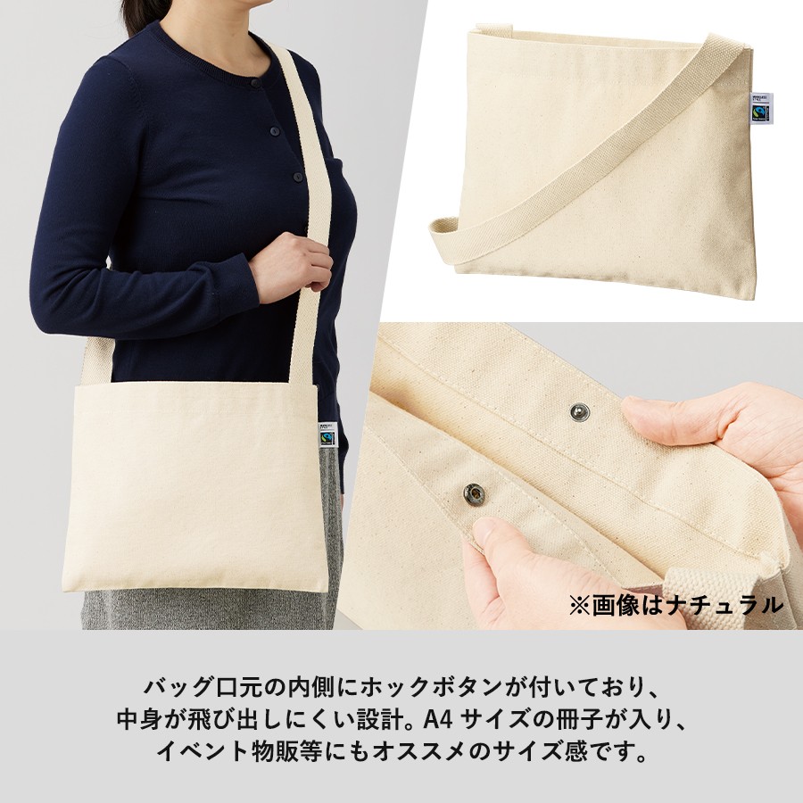 フェアトレードコットンを使用した横長のベーシックなシンプルサコッシュです。厚みがあり透け感の心配もなくしっかりとした生地です。バッグの口元にはホックボタンがついており、誤って荷物が飛び出てしまうことを防ぎます。ショルダーテープにもフェアトレード認証のオーガニックコットンを使用しております。A4サイズも収納可能なのでイベント物販などにおすすめです。国際フェアトレード認証ラベル付きのアイテムとなっており、SDGsやサスティナブルへの取り組みで企業価値を高められます。染色工場もフェアトレード認定工場で生産されており、染料は第三者認証を受けた製造工場で生産しているものを使用しております。