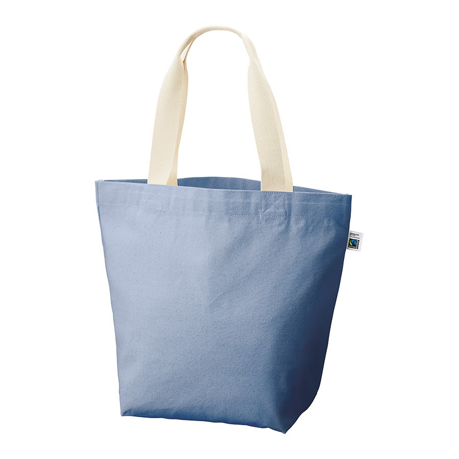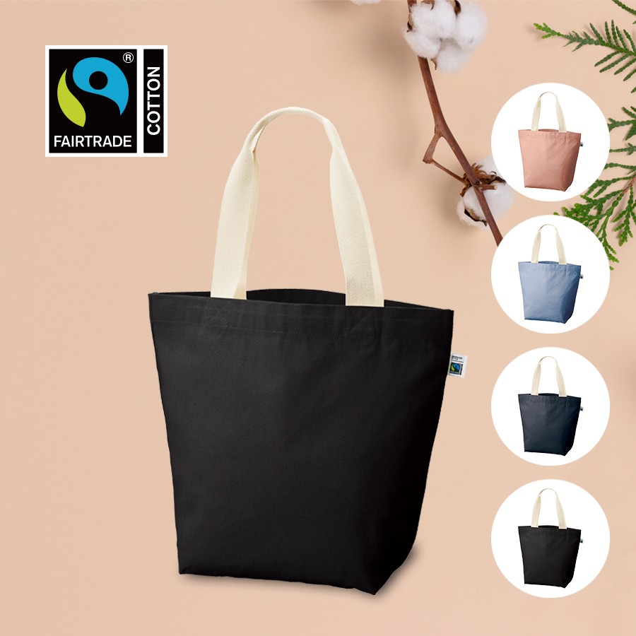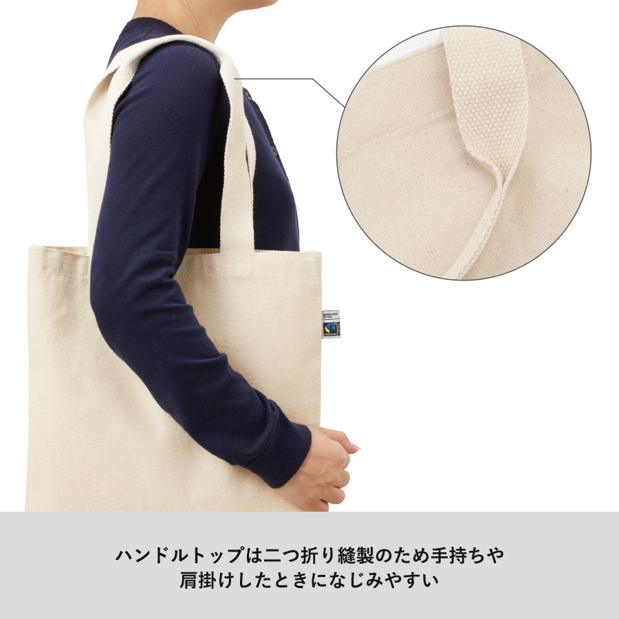 フェアトレードコットンを使用したコットンキャンバスバッグです。厚みがあり丈夫なため、お買い物バッグなどでも使用していただけます。持ち手は二つ折りで縫製されており肩にフィットする形となってます。サイズは他にSサイズ・Mサイズも展開しております。国際フェアトレード認証ラベル付きのアイテムとなっており、SDGsやサスティナブルへの取り組みで企業価値を高められます。染色工場もフェアトレード認定工場で生産されており、染料は第三者認証を受けた製造工場で生産しているものを使用しております。