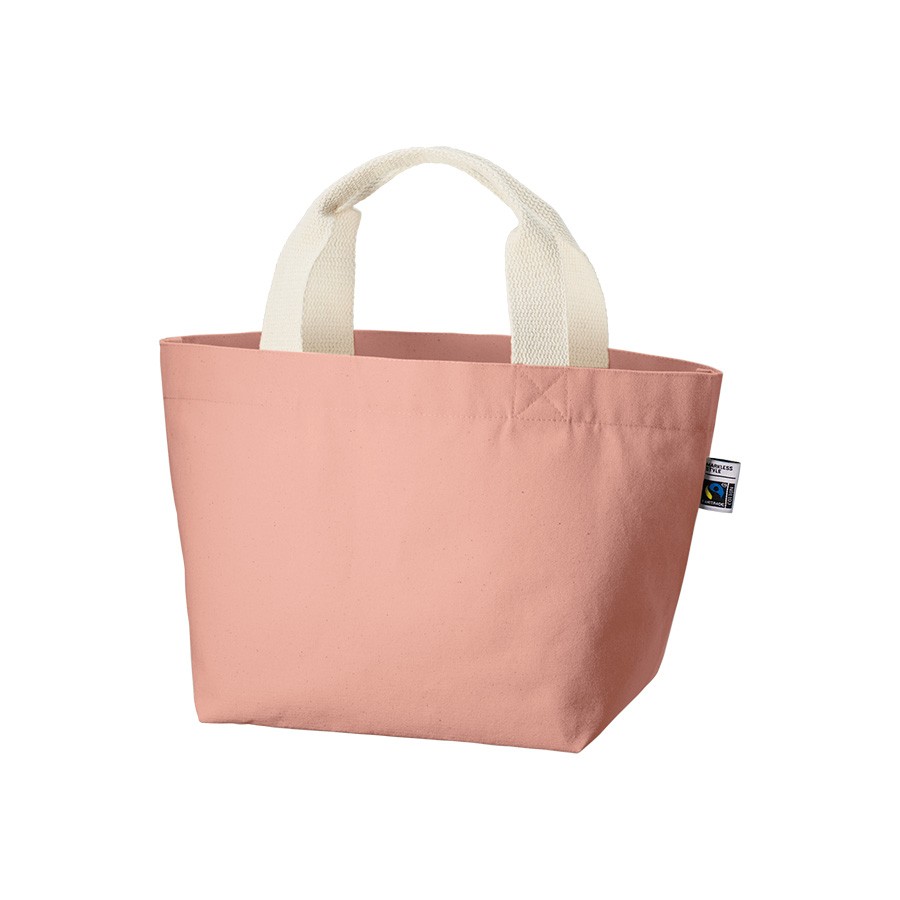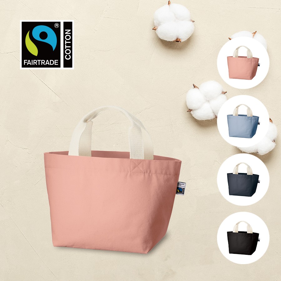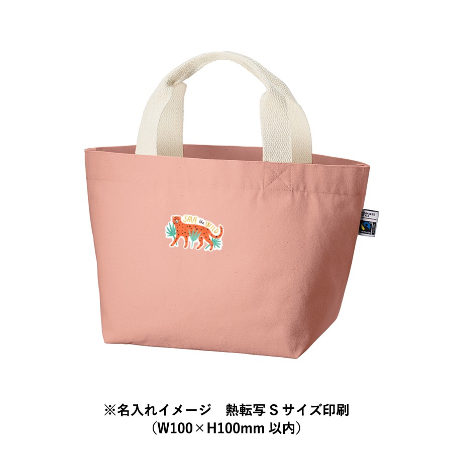 フェアトレードコットンを使用した内ポケット付きコットンキャンバストートです。厚みがあり丈夫で、お弁当やランチタイムでの持ち歩きにぴったりなサイズ感です。サイズは他にもMサイズ・Lサイズの2サイズ展開しています。国際フェアトレード認証ラベル付きのアイテムとなっており、SDGsやサスティナブルへの取り組みで企業価値を高められます。染色工場もフェアトレード認定工場で生産されており、染料は第三者認証を受けた製造工場で生産しているものを使用しております。
