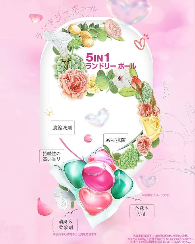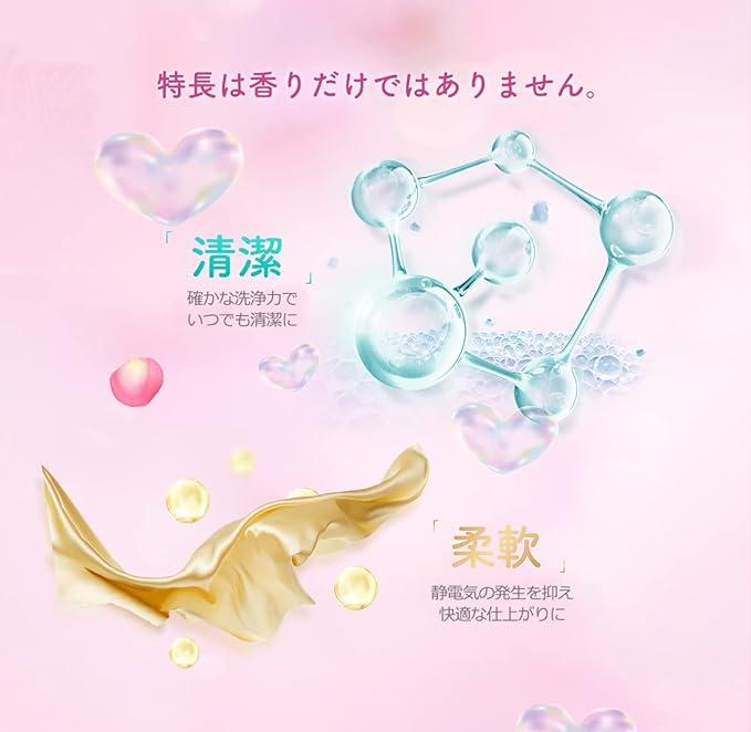 ①抜群の洗浄力*(*当社比) ②独自の抗菌技術を用いて菌の繁殖を徹底抑制*(*すべての菌に効果があるわけではありません) ③柔軟効果 ④消臭*(部屋干し臭を取り除く)効果 ⑤16週間*(保管状態によって異なります。弊社研究所の調査による)続く優雅な香り