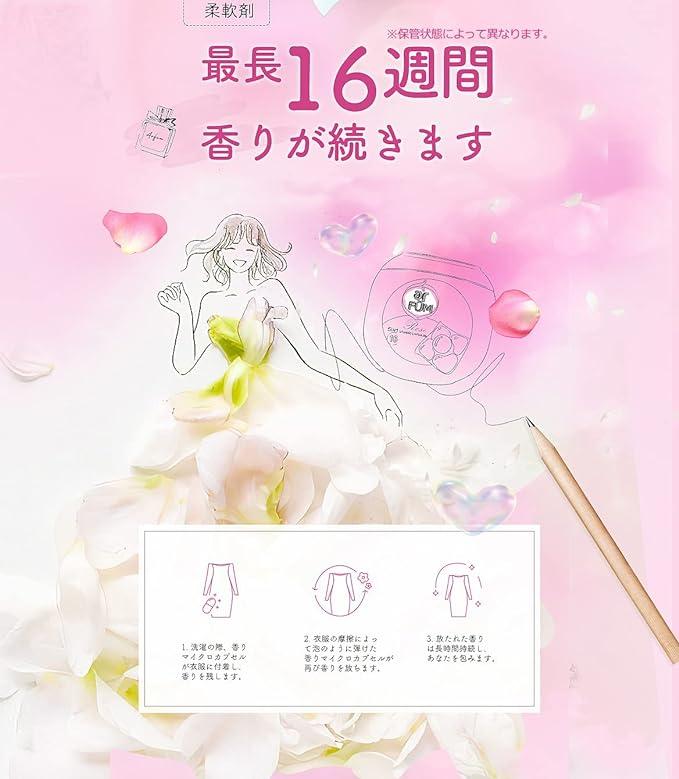 この商品について ①抜群の洗浄力*(*当社比) ②独自の抗菌技術を用いて菌の繁殖を徹底抑制*(*すべての菌に効果があるわけではありません) ③柔軟効果 ④消臭*(部屋干し臭を取り除く)効果 ⑤16週間*(保管状態によって異なります。弊社研究所の調査による)続く優雅な香り