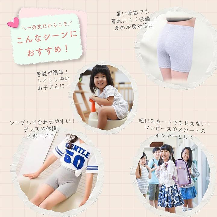 「幅広いシーン活用」1分丈タイプは制服や部活動に合わせやすく、学校生活や習い事にも対応します。