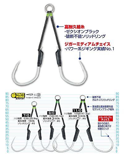 ジガーミディアムチェイスに掛かり&ホールド力を高めたツインフックタイプ登場!!キハダ・マグロ類・ヒラマサなど大型魚狙いにオススメです。フック:ジガーミディアムチェイス・パワー系ジギング実績No.1組糸:高耐久組糸・ゼクシオンブラック・破断不能ソリッドリング