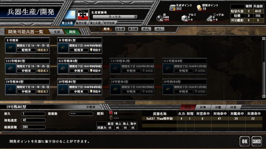 戦略を以て機先を制せよ! 欧州、北アフリカの地で鋼鉄の軍馬、驀進す!収録シナリオは2本収録。いずれも北アフリカ戦線とヨーロッパ戦線の勝敗に大きく影響を与えたターニングポイントとなるシナリオ。 新作専用シナリオとして、一大戦車戦に発展する東部戦線「ツィタデレ作戦」、フランスに於けるドイツ軍の一大反攻作戦である西部戦線「ラインの守り作戦」の2本を書下ろした計6本のシナリオを収録。当時の世界情勢を忠実に再現したシナリオにより、臨場感あるプレイが楽しめます。地上を主戦場とする欧州戦線では、原油や鉄鉱石を原料にして加工される燃料や鉄、アルミといった加工物資の加工が重要な役割を持っている。資源を採掘できる根拠地を占領して、その資源を自国の工場に輸送し、そこで加工された物資を造船所や航空機工場などに輸送して、兵器を生産、運用する。この一連の戦略を、戦線の拡大と平行して練ることが戦争を征する鍵となる。登場兵器には「ティーガー」などの有名兵器から、史実では間に合わなかったドイツのジェット戦闘機「Ta-183」やアメリカの戦略爆撃機「B-36」など戦後活躍した名機も。 陸海空の全680種類の兵器がヨーロッパの戦場で暴れまわる!