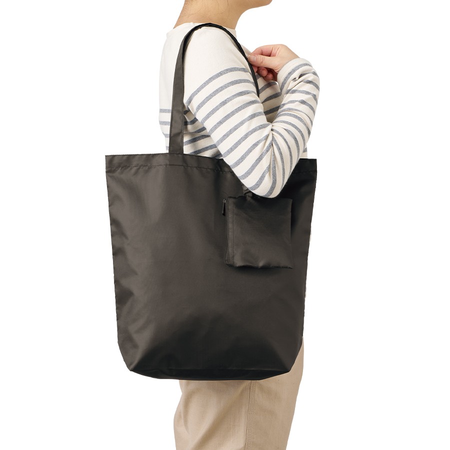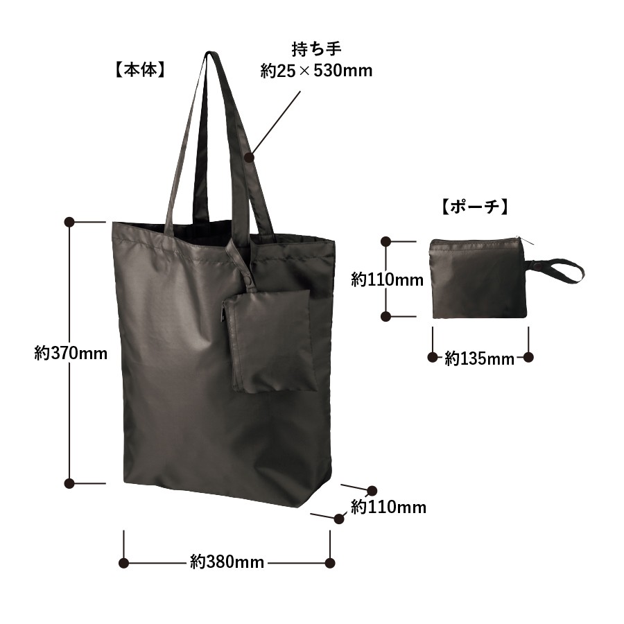 ポーチに入れてコンパクトに持ち歩ける便利なポケッタブルトートバッグです。独自の厚さでPUコーティングを施しているため、しなやか且つ耐久性のある生地に仕上がっています。付属ポーチはホック付きストラップでトート本体に下げることのできる仕様なので、本体はもちろん、ポーチに名入れをすれば訴求力も抜群です。普段はご自身のバッグのハンドルに吊るして持ち歩くことができる優れものです。M・Lの2サイズ展開で、MサイズはA4サイズを縦にいれることができる程よいサイズ感で、日頃のお買い物バッグやサブバッグとして、毎日持ち歩きたいアイテムです。またフルカラー印刷対応で、お店のロゴやブランド名、キャラクターなどを再現できノベルティや購入特典、オープン記念など様々な業界や案件でご提案いただけます。