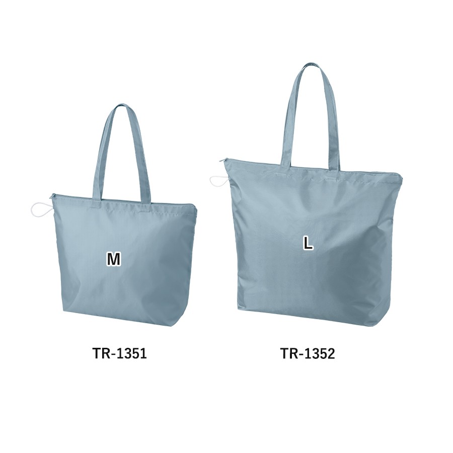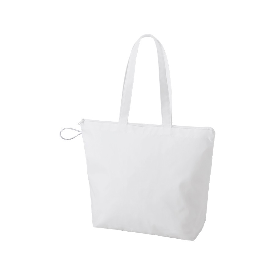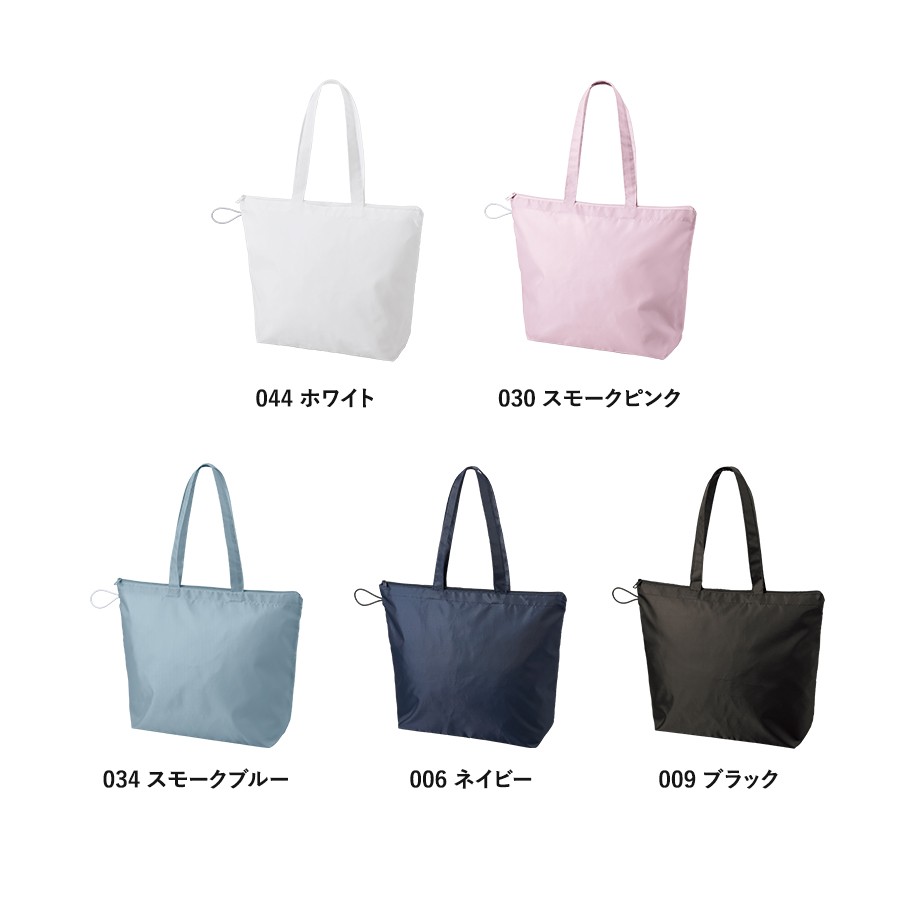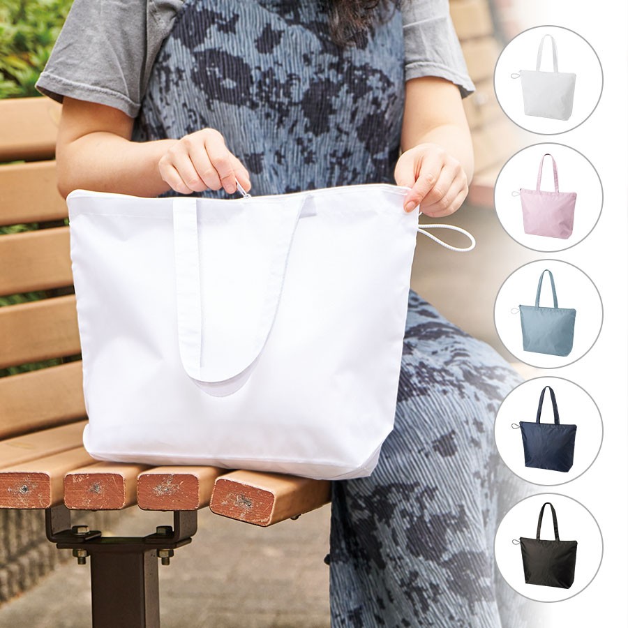 ファスナー付きで安心なポケッタブルトートバッグです。独自の厚さでPUコーティングを施しているため、しなやか且つ耐久性のある生地に仕上がっています。たくさんお買い物をしたときや、荷物が多いときにもファスナーを閉めれば、中身を見られることがなく、荷物が飛び出る心配もないため安心して使用することができます。また旅行の際、サイドのゴムでコンパクトにまとめて持っておけば、お土産など荷物が増えてしまったときにもサブバッグとして重宝します。M・Lの2サイズ展開で、MサイズはA4サイズが横向きにきれいに収まるサイズ感です。全色熱転写印刷でフルカラー対応しており、またホワイトのみ昇華転写にも対応しているのでエンタメ案件のご提案にもおすすめです。