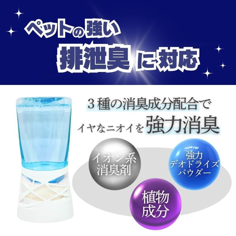 ・ペットのトイレ、ケージ近くに置くだけでオシッコ臭をマスキングし、良い香りが続く。・「ボトルが上」で上から下に液が落ちるから、最後の1滴まで香りがしっかり続いてずーっと消臭。・アクアソープの香り。