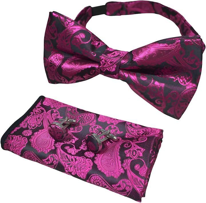 「立体感あるジャガード織りで魅せる、ペイズリー柄フォーマルアクセサリー3点セット」上品なペイズリー柄をジャガード織りで表現した、蝶ネクタイ(ボウタイ)、ポケットチーフ、カフスボタンを組み合わせたフォーマルアクセサリー3点セットです。