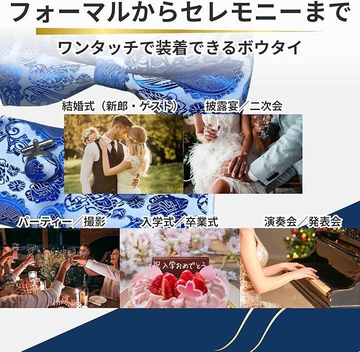 結婚式、披露宴、パーティー、式典、撮影、ステージ衣装など幅広いシーンで使いやすいメンズ向け蝶ネクタイセットです。