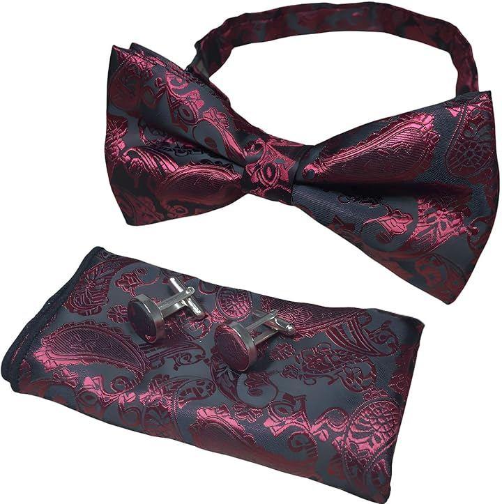 Paisley-patterned 3-piece bow tie, pocket square, and cufflinks set for tuxedos, weddings, and parties