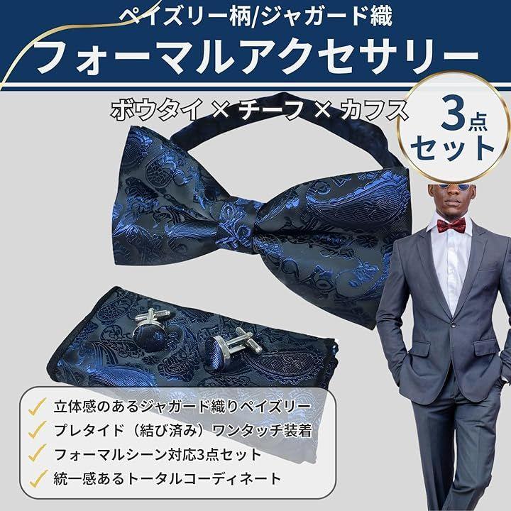 「立体感あるジャガード織りで魅せる、ペイズリー柄フォーマルアクセサリー3点セット」上品なペイズリー柄をジャガード織りで表現した、蝶ネクタイ(ボウタイ)、ポケットチーフ、カフスボタンを組み合わせたフォーマルアクセサリー3点セットです。
