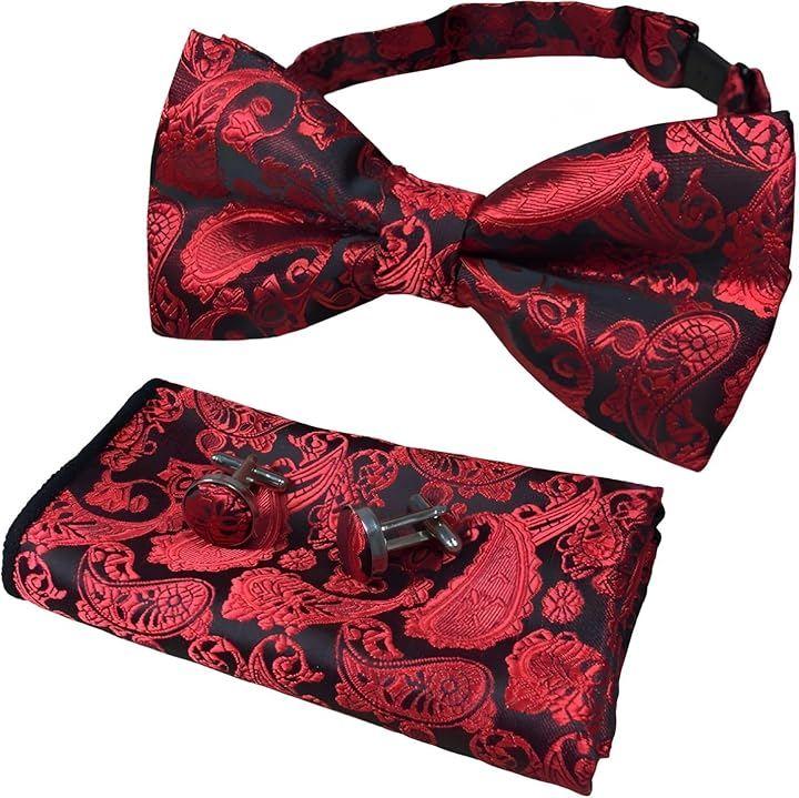 「立体感あるジャガード織りで魅せる、ペイズリー柄フォーマルアクセサリー3点セット」上品なペイズリー柄をジャガード織りで表現した、蝶ネクタイ(ボウタイ)、ポケットチーフ、カフスボタンを組み合わせたフォーマルアクセサリー3点セットです。