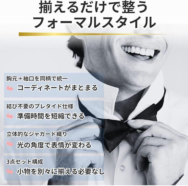 「商品仕様」〇セット内容:蝶ネクタイ、ポケットチーフ、カフスボタンの3点セット。