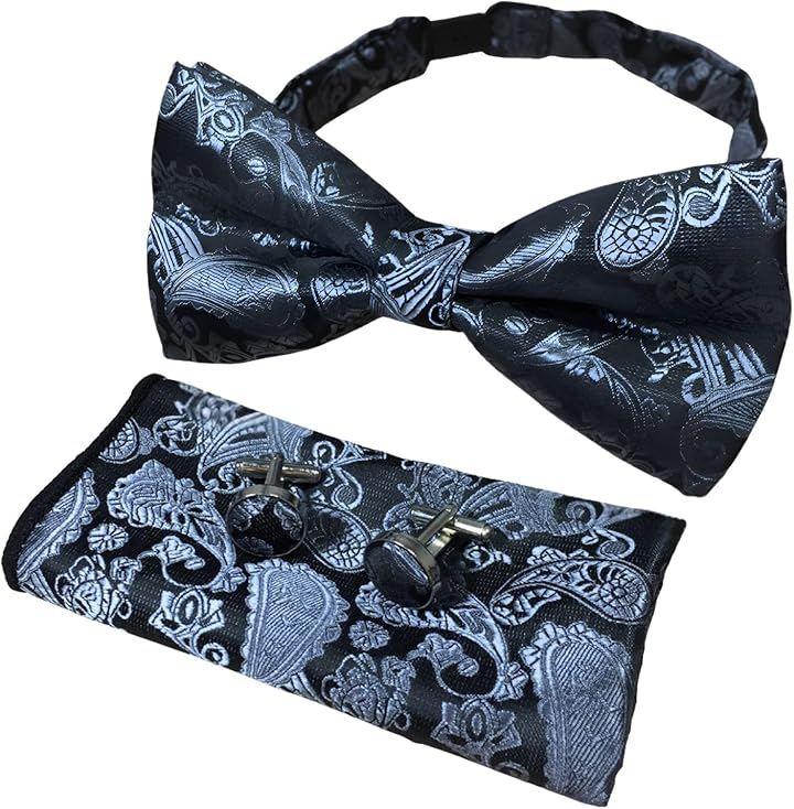 「立体感あるジャガード織りで魅せる、ペイズリー柄フォーマルアクセサリー3点セット」上品なペイズリー柄をジャガード織りで表現した、蝶ネクタイ(ボウタイ)、ポケットチーフ、カフスボタンを組み合わせたフォーマルアクセサリー3点セットです。