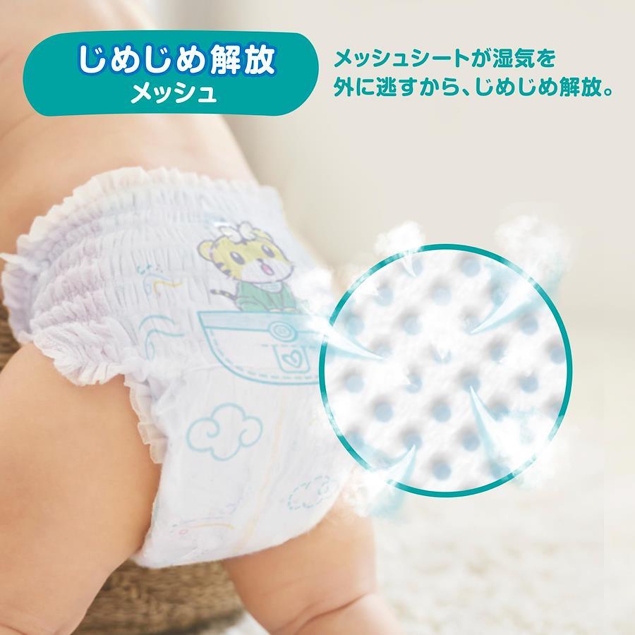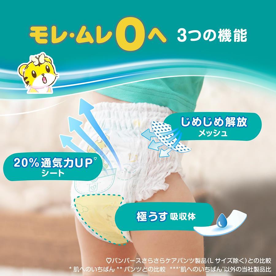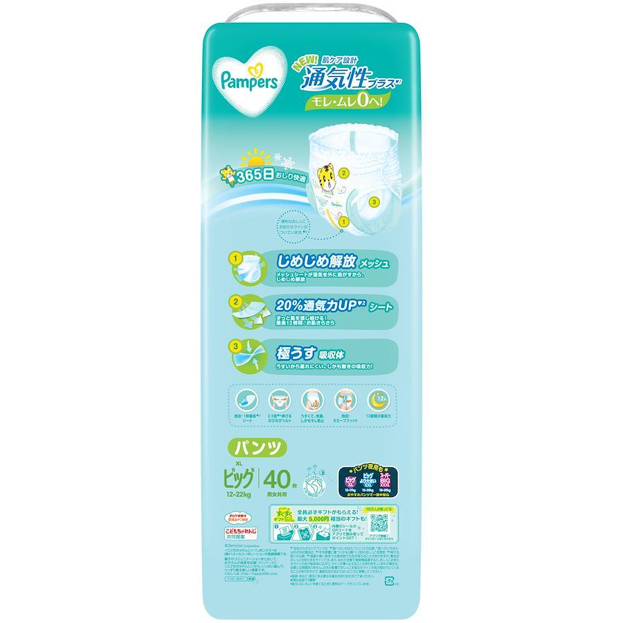 ?1 当社さらさらケアパンツ比 ?2 肌へのいちばん*パンツとの比較 *‘肌へのいちばん’以外の当社製品比 ?3 平均尿量に基づく(P&G調べ) 2回のおしっこを想定 ?4 伸びる前との比較 【NEW! パンパース 通気性プラス パンツ】じめじめ解放メッシュで365日赤ちゃんのおしり快適!夏は蒸し暑さで、冬は厚着でおむつのムレが心配。そして長時間履いているとお肌が荒れないか心配…。そんな時は肌ケア設計の通気性プラス パンツ! 【じめじめ解放メッシュ】メッシュシートが湿気を外に逃がすから、じめじめ解放! 【20%通気力UPシート】通気力UPシートがずっと風を通し続けるから、最長12時間お肌さらさら。 *パンパース 肌へのいちばんパンツとの比較 【極うす吸収体】薄いから蒸れにくい。しかも驚きの吸収力。薄さと吸収力を両立しました。 【エアリー腰回りギャザー】まるでおむつが呼吸するような通気性でお肌快適 乳幼児用パンツ紙おむつ ビッグ(XL)サイズ(12~22kg)