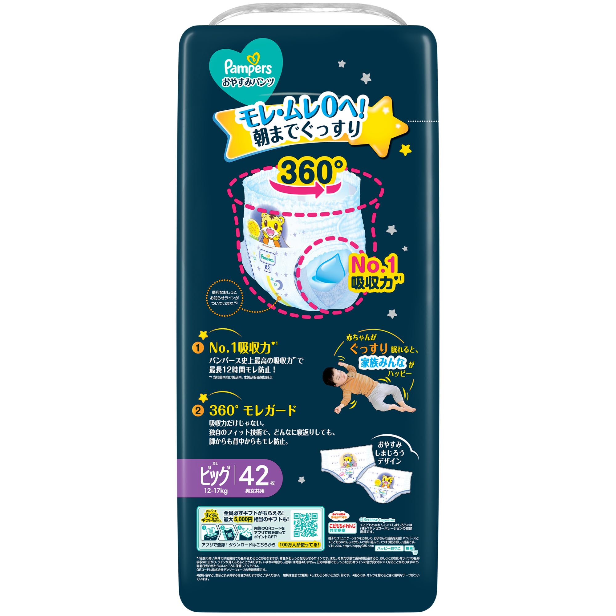 【パンツ ビッグサイズ】パンパース オムツ 夜用 おやすみパンツ (12~17kg) 【パンパース おやすみパンツ おねしょ防止パッド新採用!】夜は昼の10倍モレやすい*。おねしょ防止パッドを搭載し、一晩中のおしっこを受け止めます。夜もモレ・ムレ安心。 * P&G調べ(Lサイズ, N=115) 【パンパース史上最高**の吸収力!】お腹から背中まで吸収体がしっかり覆うから、どの角度からもモレをSTOP! 一晩中のおしっこを3回分までも吸収。 **さらさらケアパンツ同サイズとの比較 【360°モレガード】独自のフィット技術で寝返り時の脚モレも背中モレも防止。 ふわふわやわらか素材の吸収体を使用。ベルトは2.5倍伸びる^からお腹周りにフィットし、かつ動きやすい。ずっと快適。 ^伸ばす前との比較 乳幼児用パンツ紙おむつ ビッグサイズ(12~17kg)