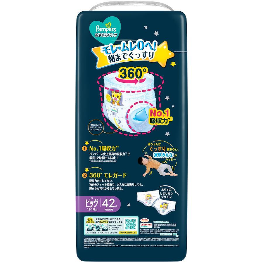 【パンツ ビッグサイズ】パンパース オムツ 夜用 おやすみパンツ (12~17kg) 【パンパース おやすみパンツ おねしょ防止パッド新採用!】夜は昼の10倍モレやすい*。おねしょ防止パッドを搭載し、一晩中のおしっこを受け止めます。夜もモレ・ムレ安心。 * P&G調べ(Lサイズ, N=115) 【パンパース史上最高**の吸収力!】お腹から背中まで吸収体がしっかり覆うから、どの角度からもモレをSTOP! 一晩中のおしっこを3回分までも吸収。 **さらさらケアパンツ同サイズとの比較 【360°モレガード】独自のフィット技術で寝返り時の脚モレも背中モレも防止。 ふわふわやわらか素材の吸収体を使用。ベルトは2.5倍伸びる^からお腹周りにフィットし、かつ動きやすい。ずっと快適。 ^伸ばす前との比較 乳幼児用パンツ紙おむつ ビッグサイズ(12~17kg)