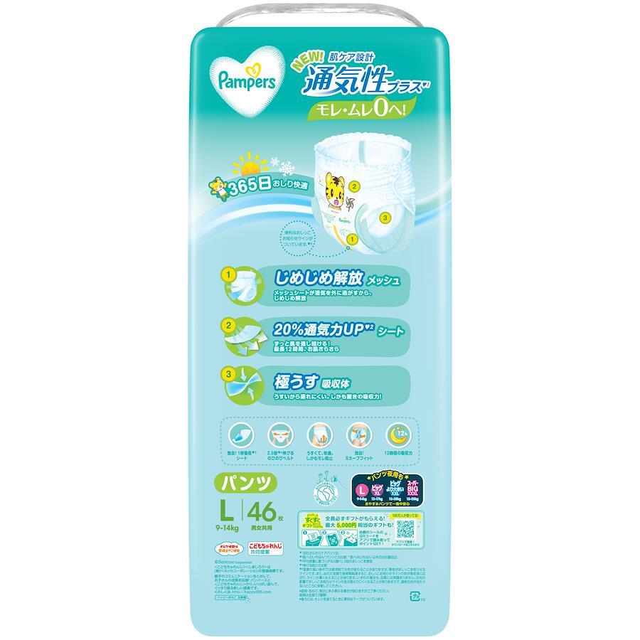 ?1 当社さらさらケアパンツ比 ?2 肌へのいちばん*パンツとの比較 *‘肌へのいちばん’以外の当社製品比 ?3 平均尿量に基づく(P&G調べ) 2回のおしっこを想定 ?4 伸びる前との比較 【NEW! パンパース 通気性プラス パンツ】じめじめ解放メッシュで365日赤ちゃんのおしり快適!夏は蒸し暑さで、冬は厚着でおむつのムレが心配。そして長時間履いているとお肌が荒れないか心配…。そんな時は肌ケア設計の通気性プラス パンツ! 【じめじめ解放メッシュ】メッシュシートが湿気を外に逃がすから、じめじめ解放! 【20%通気力UPシート】通気力UPシートがずっと風を通し続けるから、最長12時間お肌さらさら。 *パンパース 肌へのいちばんパンツとの比較 【極うす吸収体】薄いから蒸れにくい。しかも驚きの吸収力。薄さと吸収力を両立しました。 【エアリー腰回りギャザー】まるでおむつが呼吸するような通気性でお肌快適 乳幼児用パンツ紙おむつ Lサイズ(9~14kg)