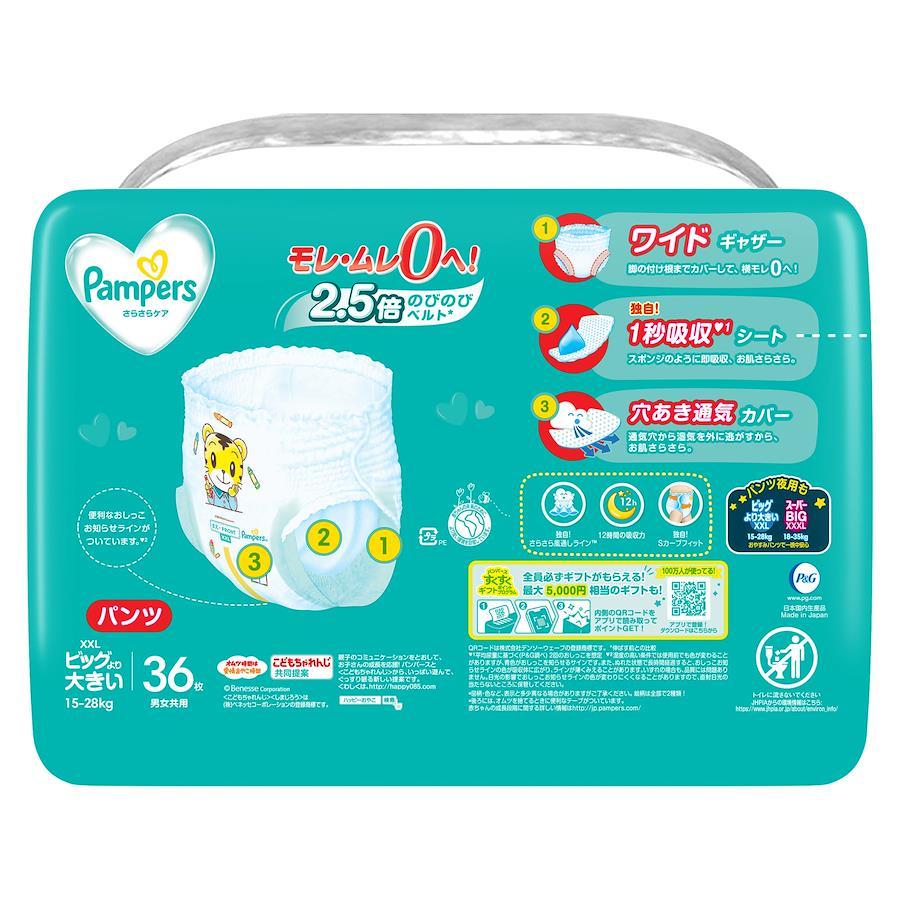 【パンツ ビッグより大きいサイズ】パンパース オムツ さらさらケア (15~28kg) 【NEW! パンパース さらさらケア パンツ】PLUS超吸収ジェルと3倍ワイドギャザー モレ・ムレ0へ! 【限定増量】36枚パック 【NEW!120%超吸収ジェル】吸収ジェルを約120%増量*、モレ・ムレ0へ!すばやく吸収・分散させ、赤ちゃんのお肌をさらさらに保ちます。 *当社従来品との比較 【3倍ワイドギャザー】従来品より3倍広くなったギャザーが足回りにぴったりフィットし、横モレをSTOP 【独自!1秒吸収シート**】スポンジのように即吸収、お肌さらさら **平均尿量に基づく(P&G調べ)2回のおしっこを想定 お肌にやさしいふわふわ素材を使用。最長12時間、一晩中の吸収力。 乳幼児用パンツ紙おむつ ビッグより大きいサイズ(15~28kg)