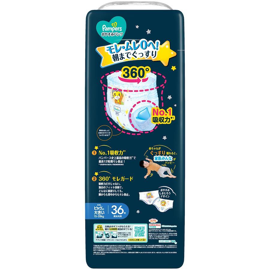 【パンツ ビッグより大きいサイズ】パンパース オムツ 夜用 おやすみパンツ (15~28kg) 【パンパース おやすみパンツ おねしょ防止パッド新採用!】夜は昼の10倍モレやすい*。おねしょ防止パッドを搭載し、一晩中のおしっこを受け止めます。夜もモレ・ムレ安心。 * P&G調べ(Lサイズ, N=115) 【パンパース史上最高**の吸収力!】お腹から背中まで吸収体がしっかり覆うから、どの角度からもモレをSTOP! 一晩中のおしっこを3回分までも吸収。 **さらさらケアパンツ同サイズとの比較 【360°モレガード】独自のフィット技術で寝返り時の脚モレも背中モレも防止。 ふわふわやわらか素材の吸収体を使用。ベルトは2.5倍伸びる^からお腹周りにフィットし、かつ動きやすい。ずっと快適。 ^伸ばす前との比較 乳幼児用パンツ紙おむつ ビッグより大きいサイズ(15~28kg)