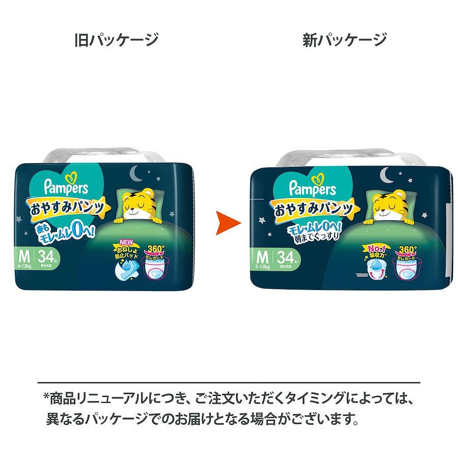 【パンツ Mサイズ】パンパース オムツ 夜用 おやすみパンツ (5~12kg) 【パンパース おやすみパンツ おねしょ防止パッド新採用!】 Mサイズパンツユーザーの3人に1人が繰り返し夜間のモレを経験しています* より幅広い月齢のお子さまの夜モレに対応! *パンパース調べ(N=8506)。一か月に一回以上のモレ経験割合34% 【パンパース おやすみパンツ おねしょ防止パッド新採用!】夜は昼の10倍モレやすい**。おねしょ防止パッドを搭載し、一晩中のおしっこを受け止めます。夜もモレ・ムレ安心。 ** P&G調べ(Lサイズ, N=115) 【パンパース史上最高***の吸収力!】お腹から背中まで吸収体がしっかり覆うから、どの角度からもモレをSTOP! 一晩中のおしっこを3回分までも吸収。 ***さらさらケアパンツ同サイズとの比較 【360°モレガード】独自のフィット技術で寝返り時の脚モレも背中モレも防止。 ふわふわやわらか素材、ふわふわ素材の吸収体を使用。ベルトは2.5倍伸びる^からお腹周りにフィットし、かつ動きやすい。ずっと快適。 ^伸ばす前との比較 乳幼児用パンツ紙おむつ Mサイズ(6~12kg)