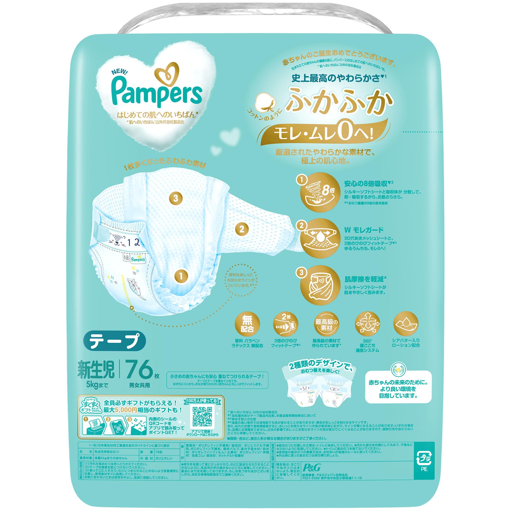 *‘肌へのいちばん’以外の当社製品比 ^当社調査(パンパースシリーズの新生児用使用率データ) #当社国内向けテープ製品内比較。本製品販売開始時点において **おむつ重量の8倍の尿を吸収 ***伸ばす前との比較 【NEW! パンパース 肌へのいちばん* テープ】コットンのようにふかふか 極上の肌心地。モレ・ムレ0へ! * '肌へのいちばん'以外の当社製品比 【限定増量】76枚パック 【NEW!クッション素材 かつてない**ふかふか心地】 パンパース史上最高**のやわらかさ 進化したWレイヤー構造により、極上のやわらかさを実現。 **当社国内向けテープ製品内比較。本製品販売開始時点において 【安心の8倍吸収】おむつ重量の8倍の尿を吸収。シルキーソフトシートと吸収体が分散して、即・吸収するから、お肌さらさら。 【Wモレガード モレ0へ!】3D穴あきメッシュシートと、2倍のびのび***フィットテープで、モレ0へ! *** 伸ばす前との比較 10年以上も病産院に選ばれてNO.1のパンパース^。 肌摩擦を軽減^^。香料・パラベン・ラテックス無配合。最高級の素材^^で作られています。 ^当社調査(パンパースシリーズの新生児用使用率データ) ^^'肌へのいちばん'以外の当社製品比 乳幼児用テープ紙おむつ 新生児サイズ(5kgまで)