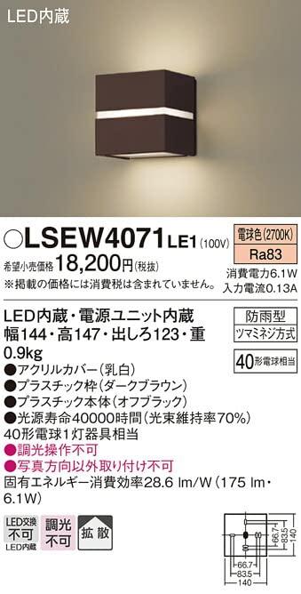 3営業日以内に発送≪新品未開封品≫:パナソニック(Panasonic) ポーチライト・勝手口灯 壁直付型 電球色・拡散・防雨型 40形 オフブラック LSEW4071LE1