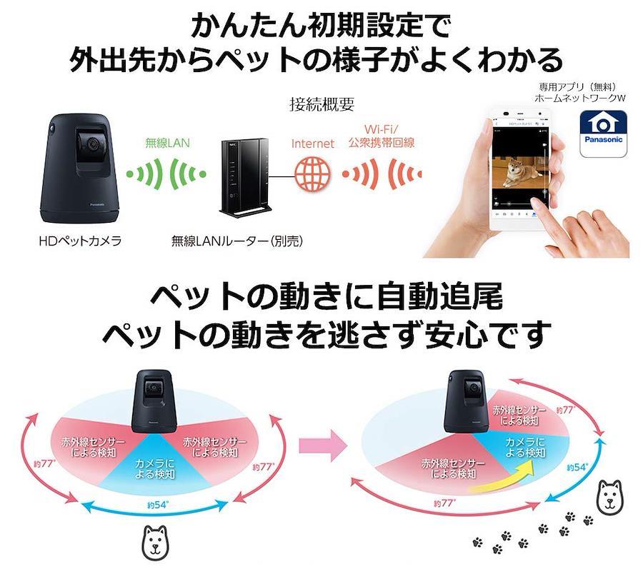 3営業日以内に発送≪新品未開封品≫:外出先のスマホからペットの日常を見守りできる。/200万画素(フルHD)高画質&自動追尾機能を搭載。/イタズラされても倒れにくい転倒防止構造(特許取得)。/ペットの日常を見守り、動画をスマホへ保存。