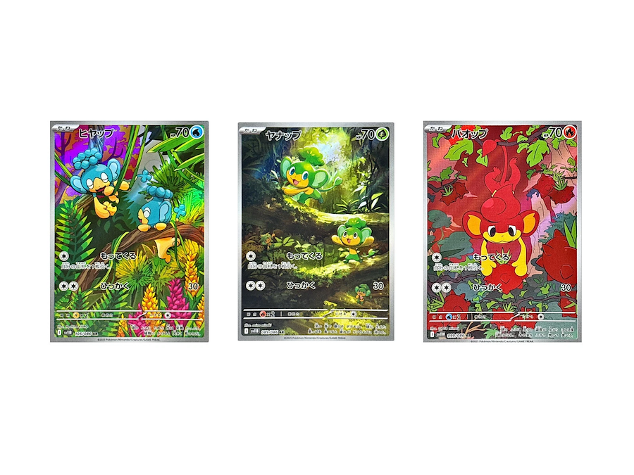 こちらは、ポケモンカードゲーム 「ブラックボルト(SV11B)」と「ホワイトフレア(SV11W)」 に収録された、人気ポケモン ヤナップ(Pansage)、バオップ(Pansear)、ヒヤップ(Panpour) のARカード3枚セットです。