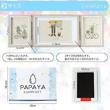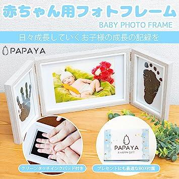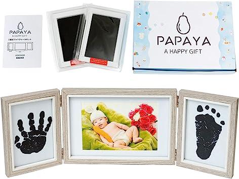 通常1-5営業日で発送:PAPAYA ベビーフォトフレーム手形足形 (3連式 手形 足形 記念品 ギフト 出産祝い 内祝い 写真立て 可愛い化粧箱 赤ちゃん) 失敗しても安心 手足を汚さないインク2枚付き