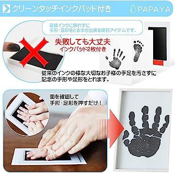 【大切な思い出が残せる】 日々成長していく赤ちゃんの成長の記録を写真と一緒に残せるメモリアルグッズです。【手足を汚さず手形が取れるインクパッド2つ付き】 付属のクリーンタッチインクパッドで赤ちゃんの手や足に直接インクをつけずに手形・足形がとれます。失敗しても安心、インクパッド2枚、台紙4枚のセットです。【有りそうで無かった3連式】 3つに折り畳めるデザインで、自由自在に設置出来るフォトフレームです。【プレゼントやギフトなど贈り物にもピッタリ】 赤ちゃんが産まれたご家庭へのプレゼントにも最適!弊社オリジナルの可愛い化粧箱に入れてお届けします。【ちょうどいいサイズ感】手形部分15.2×10.2㎝×2(はがきサイズ)&写