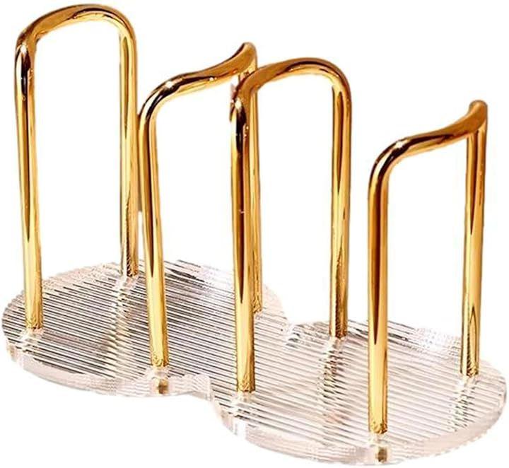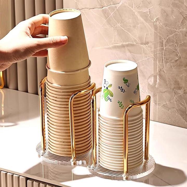 この紙コップスタンドは、スタイリッシュなゴールドの支柱と透明なベースで構成されたお洒落な収納アイテムです。