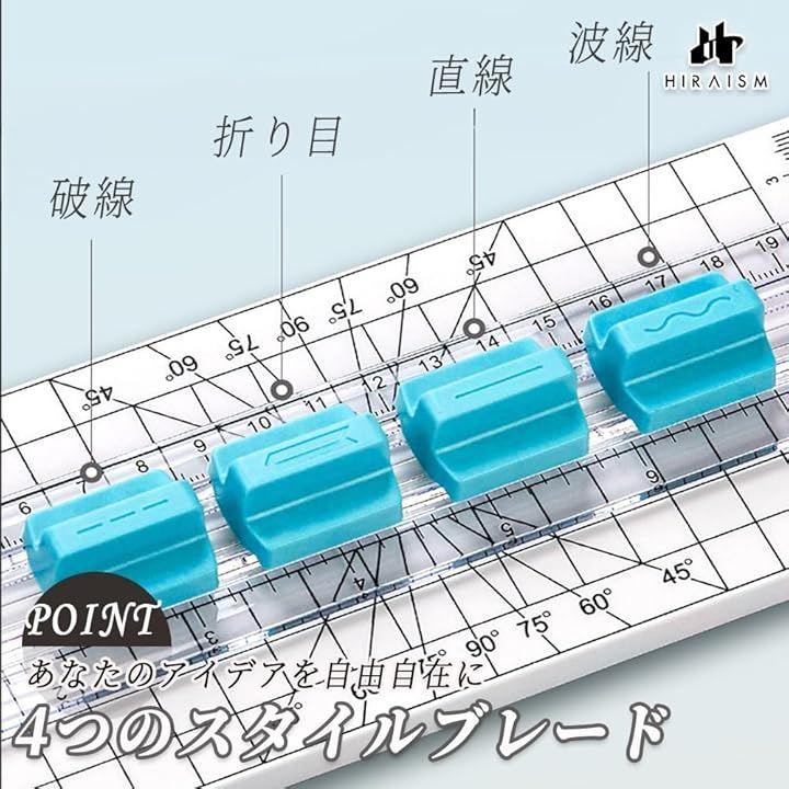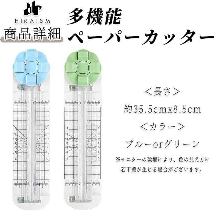 「商品内容」多機能ペーパーカッター <長さ>約35.5cmx8.5cm <カラー>ブルーorグリーン *モニターの環境により、色の見え方に若干差が生じる場合がございます。