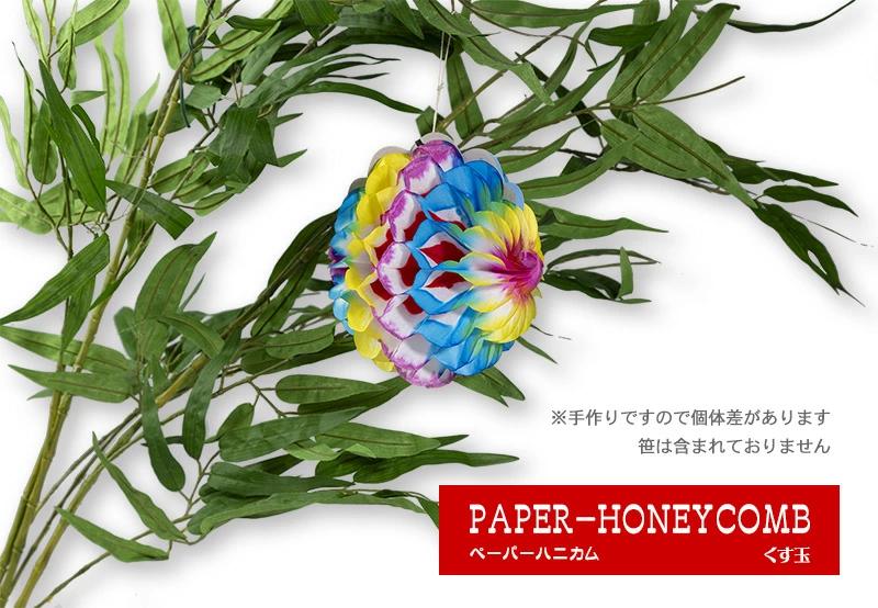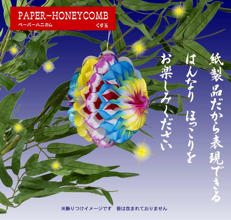 ※ペーパーハニカムとは蜂の巣(HONEYCOMB)という意味。薄紙に細く線状にのり付けし、何枚も重ねたものを広げると蜂の巣に似ているところからこう呼ばれています。主にPOP商品(広告用商品)・パーティー用品として使用されることが多いです。日本では大変珍しい弊社独自の特殊技術です。輸送は小さく、実際の使用時はボリューム感のある七夕飾りとなります。すべての材料が日本製で、自社工場で生産していますので、環境にやさしく、安心してご使用できます。七夕は短冊だけではありません。ハニカム(でんぐり)だから楽しく飾れる!他とは違ってボリュームがあり、笹が華やかになる七夕飾りをどうぞ!