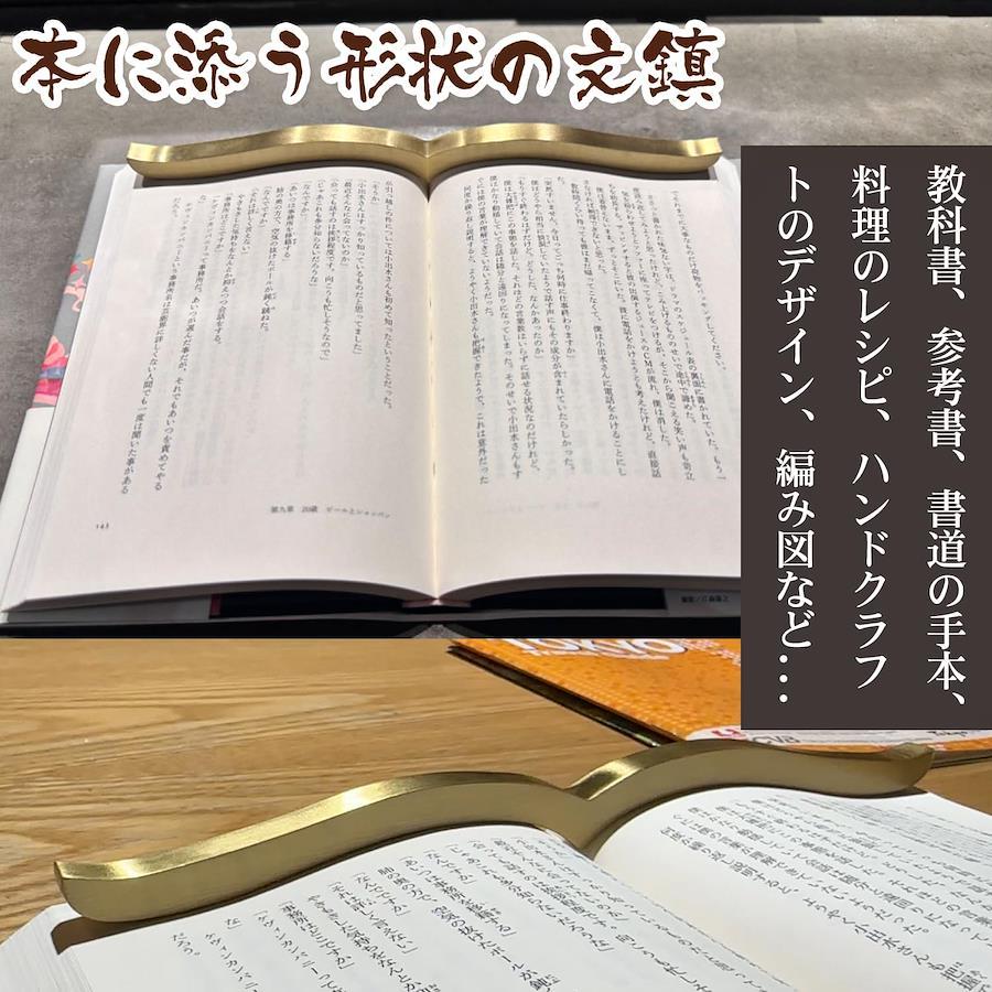 【本に添う形状の文鎮】「置き型の文鎮を作りました!」文鎮 開いた本に沿った形なので、ハードカバーや参考書などを開いたまま安定して保持することができます。文鎮 高級感のあるパッケージでプレゼントにも最適!少し横長の本でも問題なく、使用すると非常に便利です。【真鍮製】色が変化する真鍮で作られており、使い続けることで経年変化も楽しむことができます。文鎮 真鍮の素材そのものを生かした柔らかいカーブのフォルムが素敵です。外寸:W240×D10×H22mm【本を傷つけにくい・ページをめくりやすい】文鎮 は置き型なので、クリップと違って少ない手順でページをめくることができます。もう何度もページを押さえる必要はありません。クリップではページをめくるたびに挟み直す必要がありますが、文鎮ではスムーズにページをめくることができます。本を傷つけにくいです。【文鎮 読書に非常に便利】 かなり厚い本を読んだり、何かを見ながらノートに書くために、厚い文法書を開きながら勉強したり、といった時にとても役立ちます。教科書、参考書はもちろん、書道の手本、料理のレシピ、手芸の図案や編み図などなど...学習やタイピングなど、さまざまな場面で活躍します。※本によっては開けたまま保持できない場合がありますので、ご了承ください。【免責事項】メーカーによる商品リニューアルに伴いパッケージが変更が行われた場合、新パッケージでお届け致します事ご了承願います。